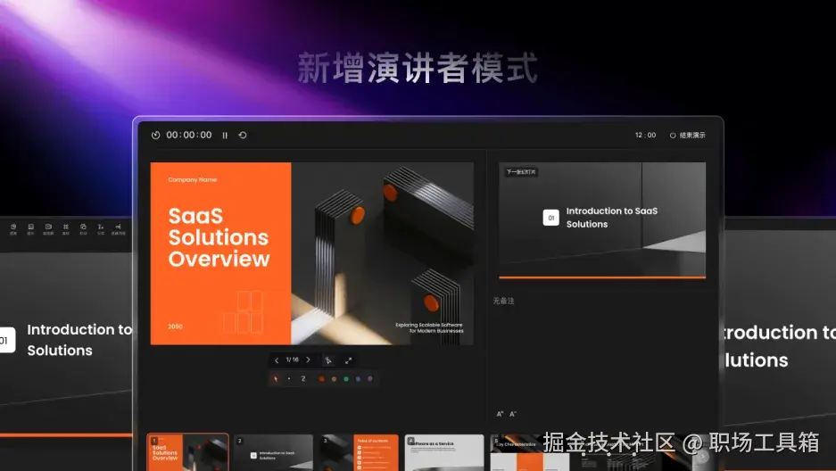 演示者视图功能使PPT展示环节变得更为便利,当大家看到你在展示PPT时,演示者视图可以在你自己的设备上展示更多信息, 比如下张幻灯片内容预览、备注等,而观众只能看到目前正在展示的幻灯片内容。这样,你可以更好地控制展示节奏,不会因忘记内容而出现尴尬沉默。同时,你还可以通过演示者视图快速跳转到指定幻灯片,或对幻灯进行临时标注,让演展过程更流畅生动。