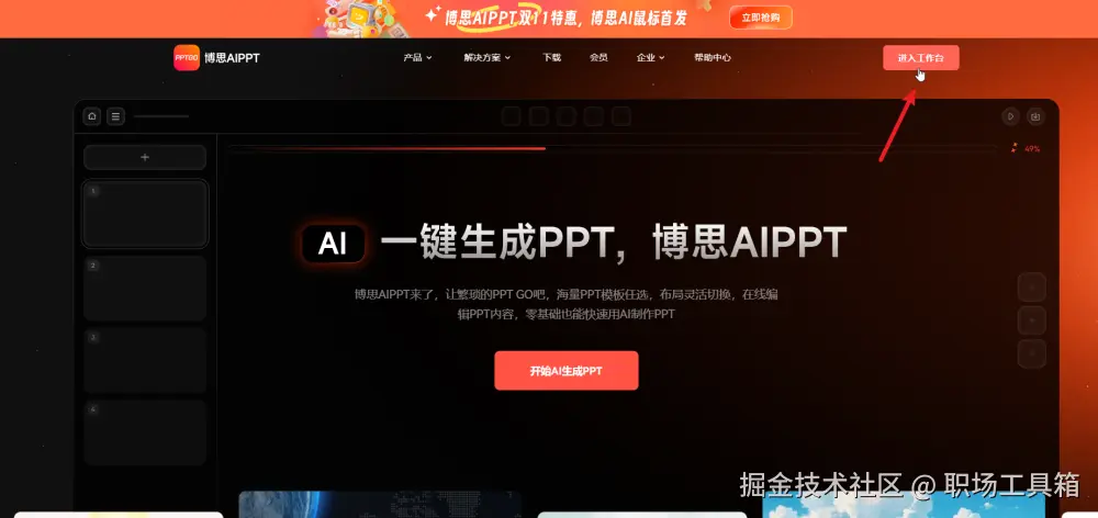 在电脑浏览器打开博思AIPPT的首页,点击右上角的“进入工作台”。