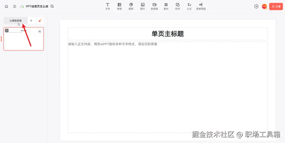 来到博思AIPPT的编辑界面,默认会添加一页空白的PPT内容页,如果想要制作PPT结尾页,可以点击左上角的“从模板新建”,打开博思AIPPT的模板库。