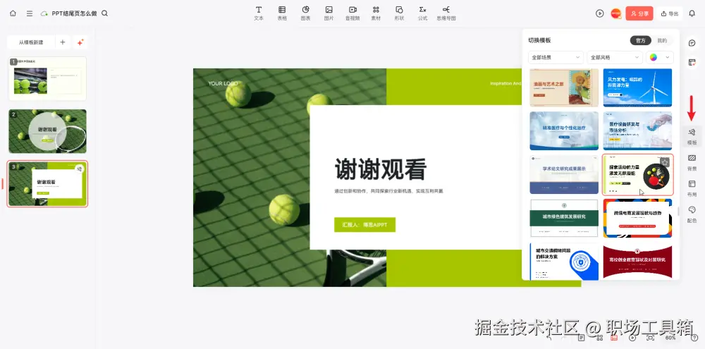 点击博思AIPPT编辑器右侧的“模板”按钮,打开切换PPT模板的面板,这里预置了上百款高品质的PPT模板,选用其中一个,可全局调节整个PPT的风格样式,包括PPT配色、PPT背景图和PPT字体等,让整个PPT焕然一新。