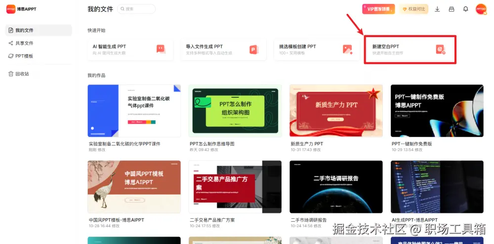 来到博思AIPPT的工作台,如下图,点击工作台右侧的“新建空白PPT”,创建一个空白的ppt文件。