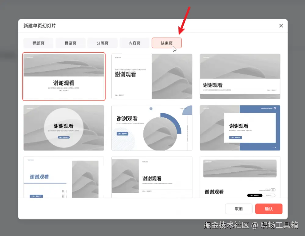 顶部可选择PPT页面类型的,切换到“结束页”类型,会列出博思AIPPT内置的所有PPT结束页模板,从中选择一个结束页模板,点击右下角的确认按钮,一键添加到当前PPT中。