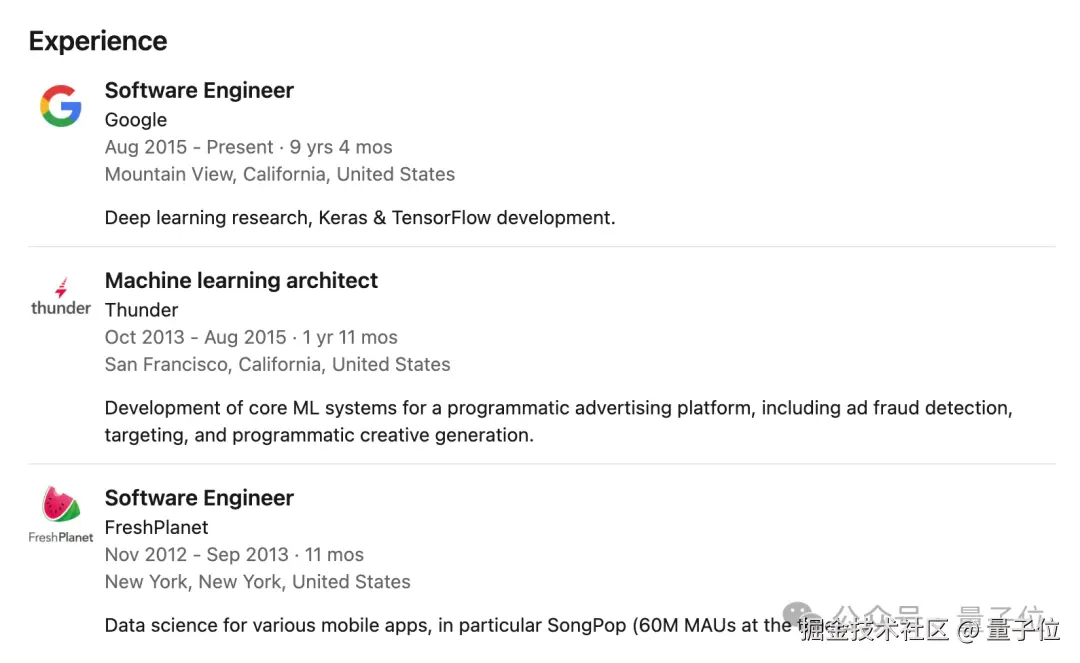 François 先后分别在 FreshPlanet 和 Thunder 分别担任软件工程师和机器学习架构师;最后于 2015 年加入谷歌,直至今天。