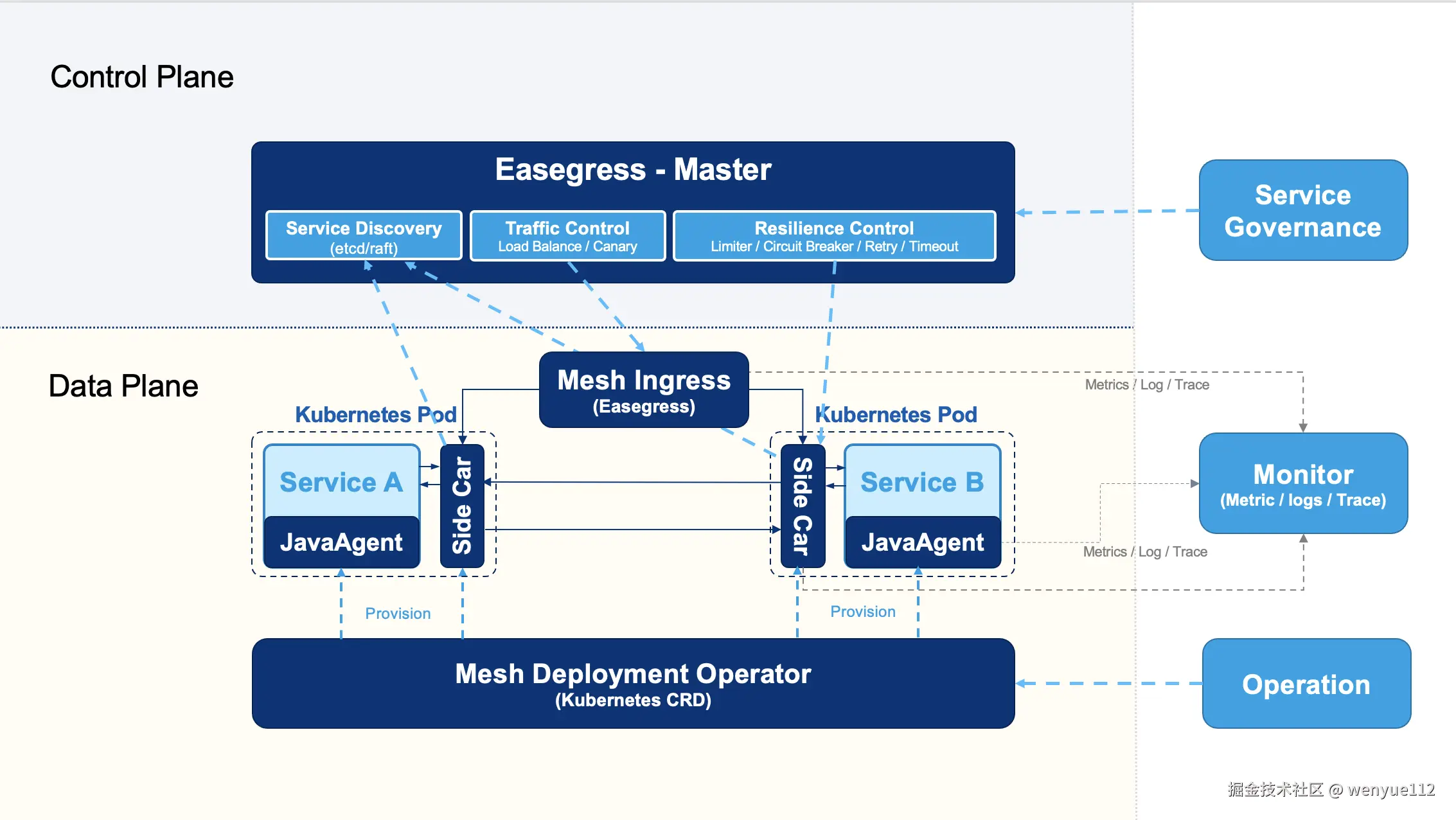 EaseMesh 是一个与Spring Cloud生态系统兼容的服务网格。它使用 Easegress (参看 下一代的流量网关) 作为边车和流量网关,并使用 EaseAgent 作为 JavaAgent 进行服务内部监控。