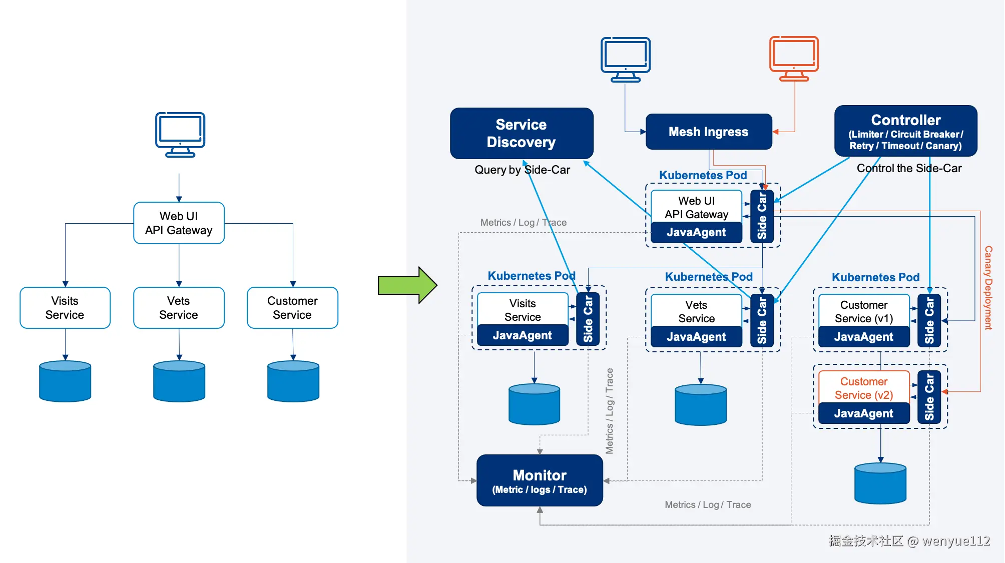 而服务发现、配置管理、流量调度、弹性与容错设计、全栈监控(指标、日志、追踪)以及整个架构的“全链路布度发布”都被整合起来。(上图的右边部分显示了该架构)
