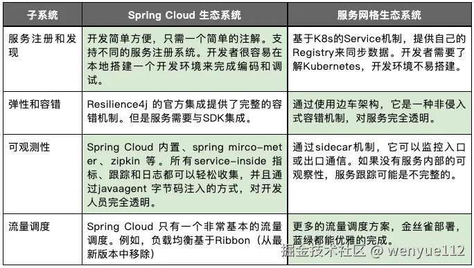 下表是 Spring Cloud 和 现有Service Mesh 的对比。