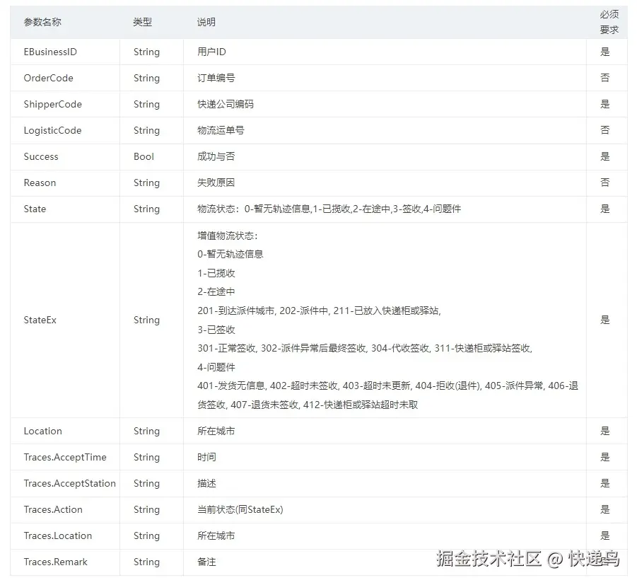 (3)返回的物流跟踪信息按照发生的时间升序排列。