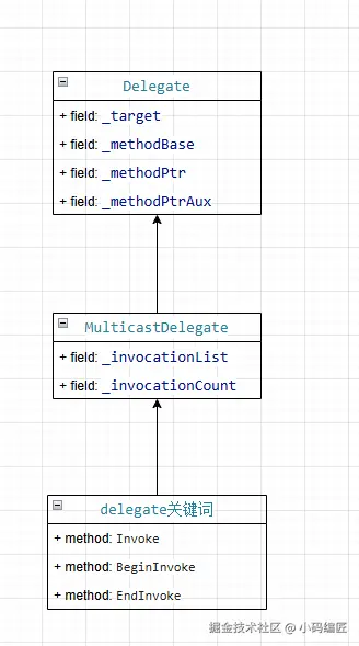 delegate关键字作为语法糖,IL层会为该关键字自动生成Invoke/BeginInvoke/EndInvoke方法,在.NET Core中,不再支持BeginInvoke/EndInvoke