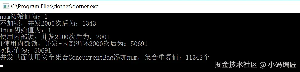Console.WriteLine($"使用内部锁,并发+内部循环{list.Count}次后为:" + num.ToString());