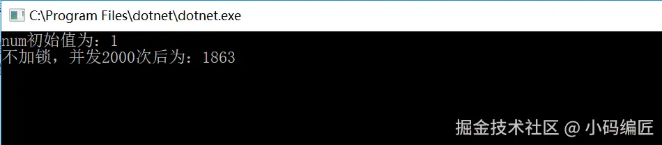 Console.WriteLine($"不加锁,并发{list.Count}次后为:" + num.ToString());