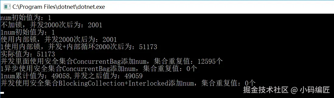 Console.WriteLine($"并发使用安全集合BlockingCollection+Interlocked添加num,集合重复值:{x.Count()}个");
