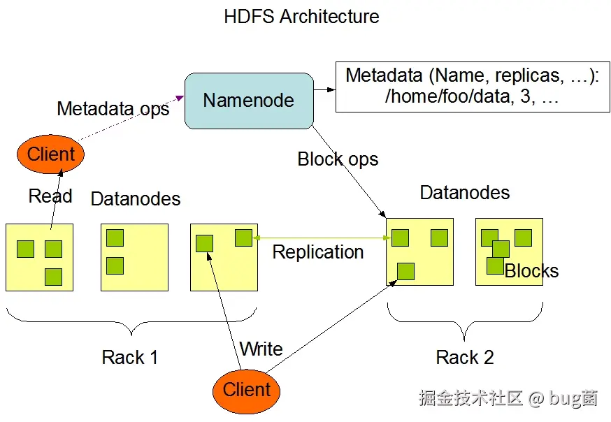 - DataNode:负责实际存储数据块,每个文件块在多个DataNode上复制保存,通常有3个副本,确保数据的高可用性。