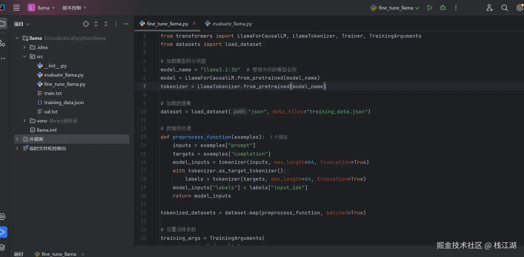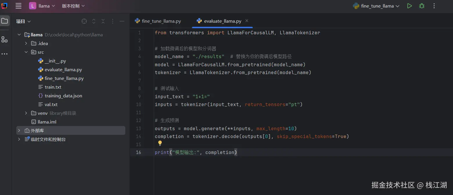 fine_tune_llama.py,用来加载模型和数据集。 - 编写微调脚本:下面是一个简化的微调脚本示例。将以下代码复制到