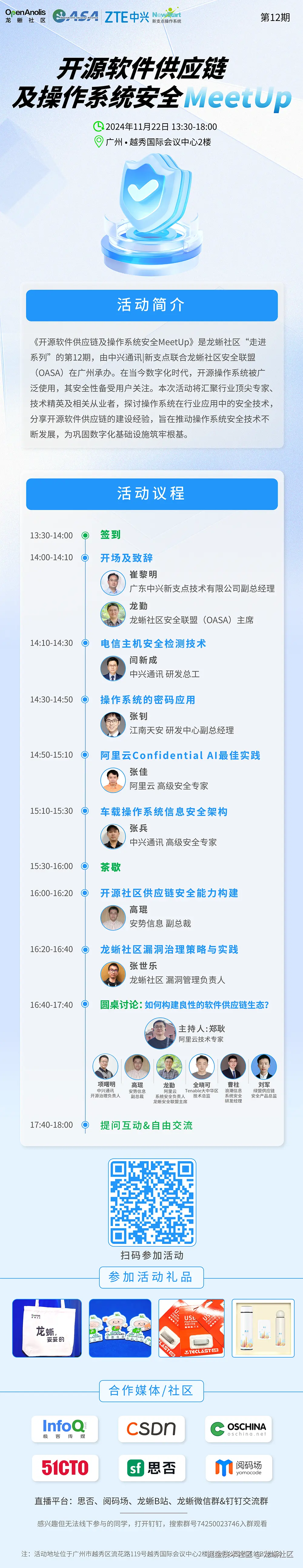 《开源软件供应链及操作系统安全 MeetUp》将于 11 月 22 日(周五) 在广州召开,由中兴通讯|中兴新支点联合龙蜥社区安全联盟共同主办。本次活动将邀请中兴通讯、江南天安、阿里云、安势信息、Tenable、浪潮信息、绿盟科技及龙蜥社区等安全领域大咖,围绕操作系统在行业应用中的安全技术、开源软件供应链建设经验展开,共同探讨操作系统在保障不同场景的应用系统中起到的关键作用和相关安全技术。此外,圆桌讨论环节邀请了业界资深技术专家,就“如何构建良性的软件供应链生态”展开深入讨论。