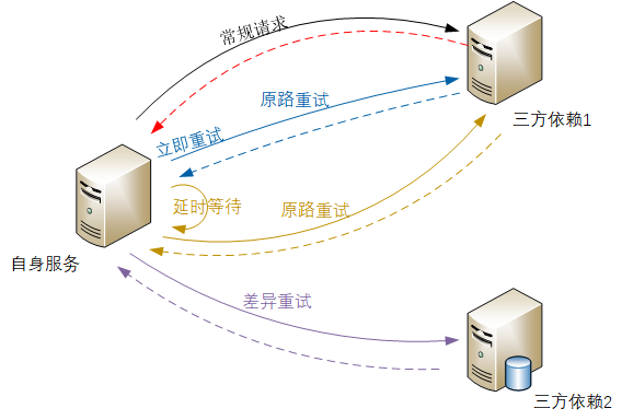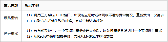 而根据重试操作的具体实现逻辑,还可以分为原路重试和差异重试: