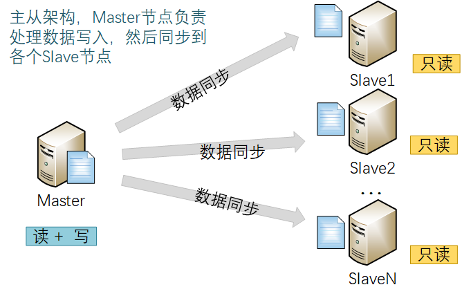最常见且最简单的多副本策略,就是Master-Slave这种架构,类似MySQL的一主多从架构。在这种架构中,通常由Master节点负责数据的写操作,然后通过内在的数据同步机制,将数据变更同步更新到各个Slave节点进行数据的多副本存储。为了提升硬件的利用率,Slave节点除了用于数据内容的多副本可靠存储,还可以对外提供只读查询操作,在必要场景下支撑业务的读写分离诉求。