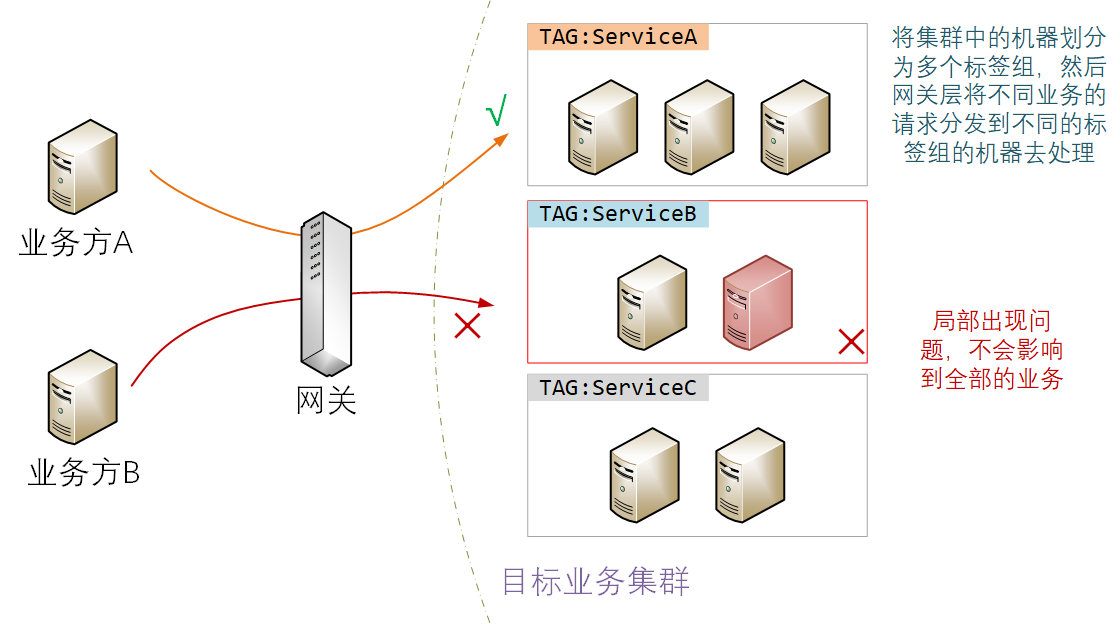 不同的业务使用不同的机器,从硬件资源层面进行隔离。通过将机器分组的方式,针对重点服务或者是高危服务实现专机专用,而对应一般普通服务,则可以多个业务混用同一套机器,从而实现了差异化的隔离处置。