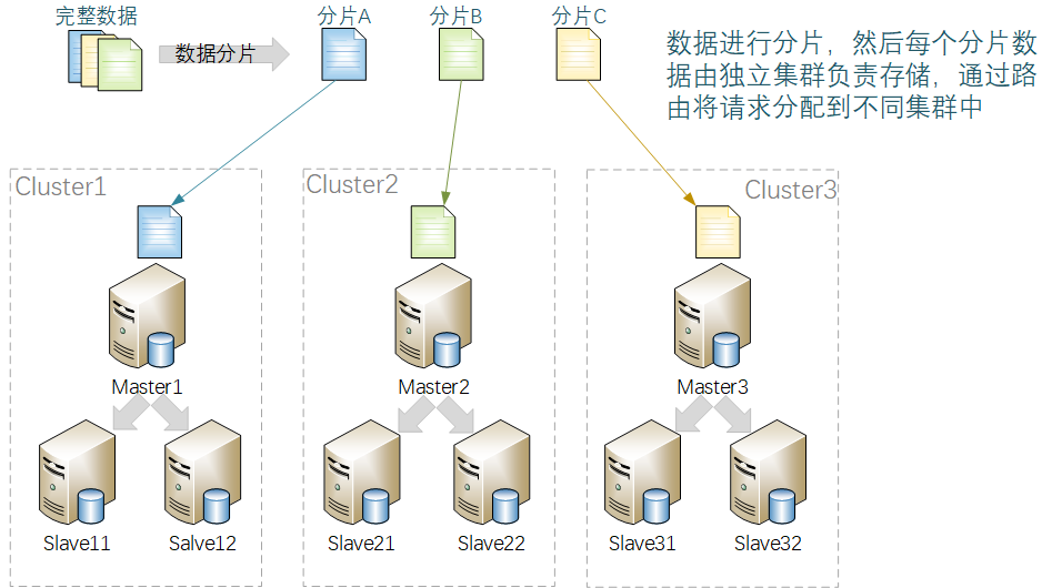Master-Slave这种主从架构的多副本策略有个致命的问题,就是每台节点存储的都是全量的数据文件,这使得数据总量_受限于单机存储_,存在瓶颈。对于超大数据量场景,还会需要更加复杂的多副本方案,对总体数据进行切片,对每个切片数据进行多副本支持,进而可以支持容量的水平扩展。像Redis集群或者是kafka所采用的便是这种策略。