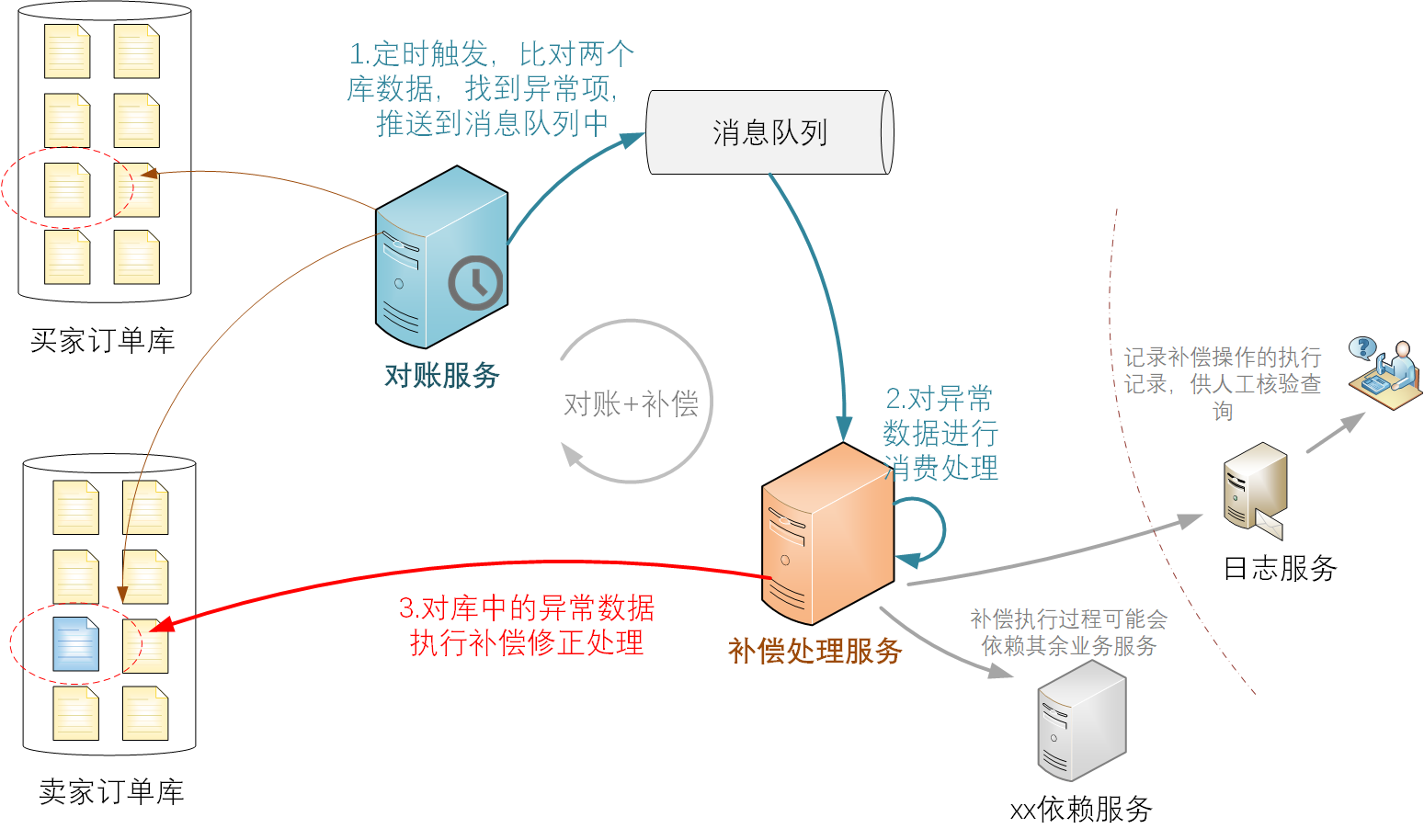 补偿机制经常被使用在分布式系统中,它的一个核心前提是,允许并接受过程中的暂时性数据问题,并通过补偿措施,保证最终的数据一致性。那么,如何知晓是否需要执行补偿操作、哪些数据需要执行补偿操作呢?这就需要“对账”了。