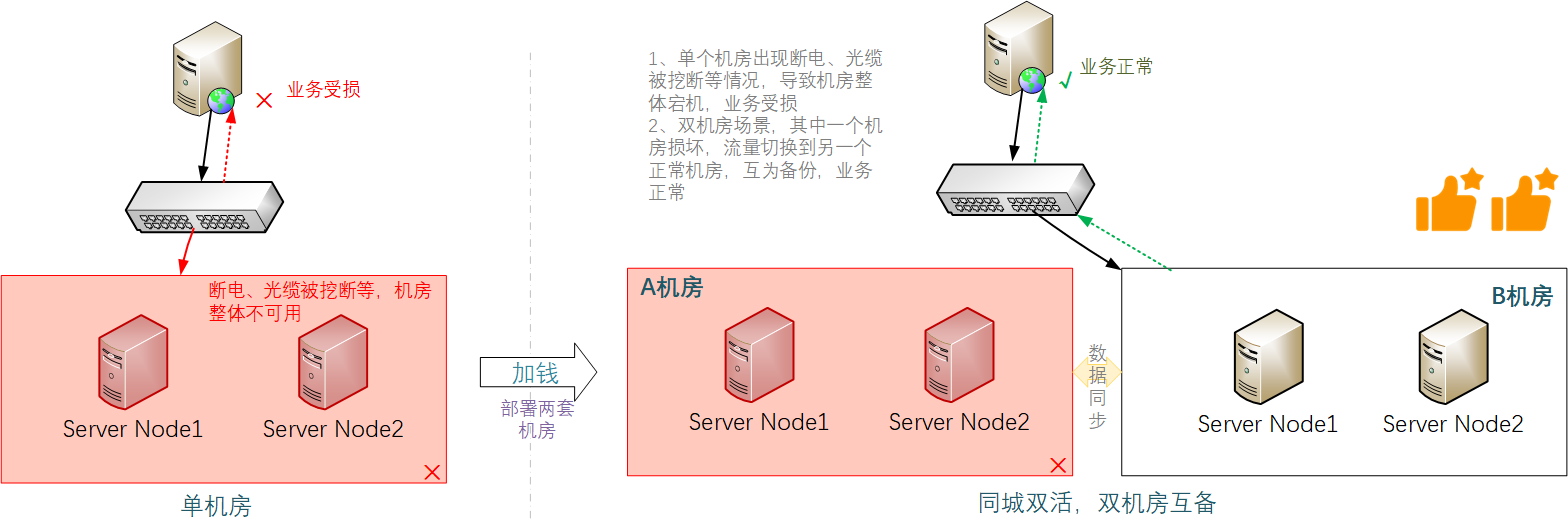 上述在同一机房内利用多个节点组成集群的方式,虽然能应对单台机器的故障场景,但如果机房出现整体故障,比如停电、着火、光缆被挖断等情况,依旧会导致全军覆没。为了应对这一可能的风险,自然而然的解决方案就是再建一个机房,这样两个机房互为备份,风险就大大降低了。通常而言,两套机房之间会涉及到数据的同步,所以对机房之间的网络传输速度与时延有极高要求,这就要求两个机房不能离得太远,最好在同一个城市。 —— 这便形成了常说的同城双活架构。