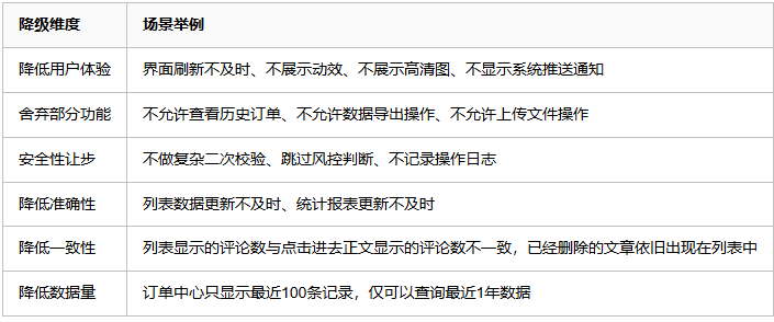 对于即时通信IM类场景,如果出现网络故障原因导致机房带宽承压有限,那就降级让视频和语音类服务不可用,尽力保障文字消息功能依旧可用