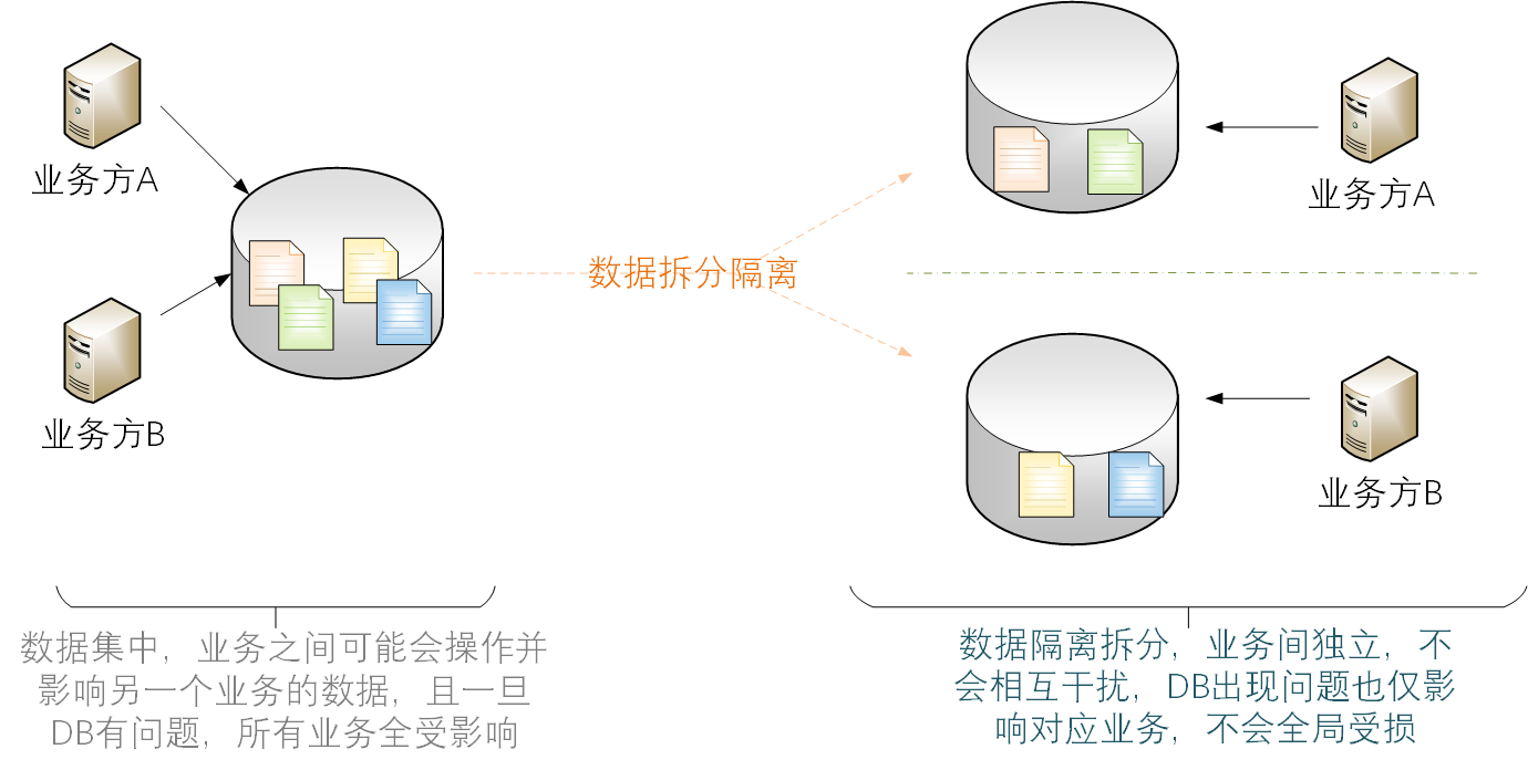 最直观的表现,就是分库分表了。比如对系统的数据,按照业务维度进行分库存储,或者按照业务的重要度进行识别,将数据识别为重点数据/非重点数据,亦或是保密数据/非保密数据,然后按照细分后的结果实施差异化的数据存储保障策略。比如,对于非重点数据,简单的搞个一主一从双副本即可, 而重点数据,可能得考虑异地多副本可靠存储与备份。