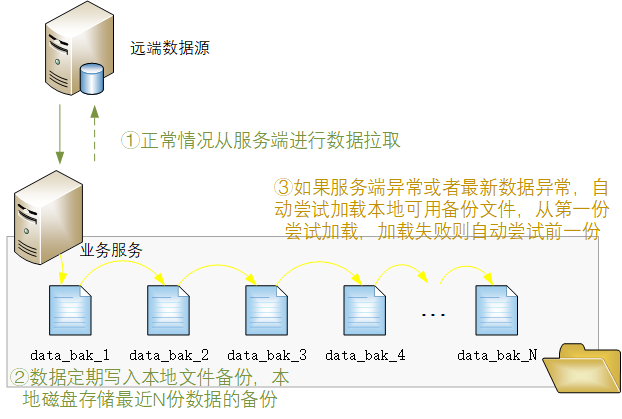 为了应对远端数据源不可控风险,定期更新的时候都会将远端获取到的数据写一份到本地磁盘中进行备份,本地磁盘保存最近N个的备份。