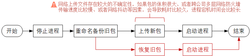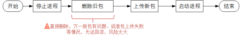 如果包的体积很大、或者上传的时候要走vpn、堡垒机等层层关卡,可能速度会比较慢,整个传输过程的耗时会很长。这种情况下,可能会导致线上进程停机时间太久。