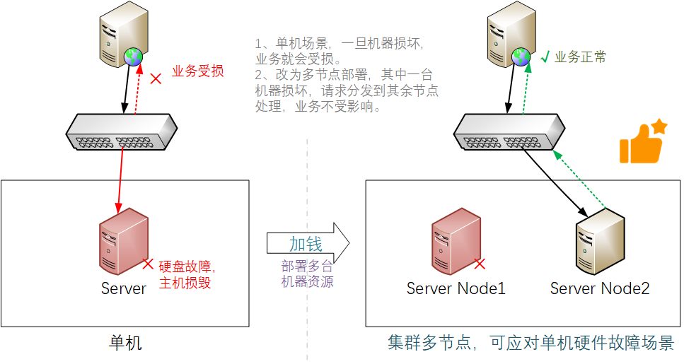 为了应对单台服务器硬件的损坏、比如硬盘损坏、电源烧毁等, 单个机房内部署多个节点,由多个不同的机器,共同组成一个集群,这样其中一个节点故障,其余节点依旧可以正常处理业务,有效避免了单点故障的出现概率,提升了业务的可靠性。