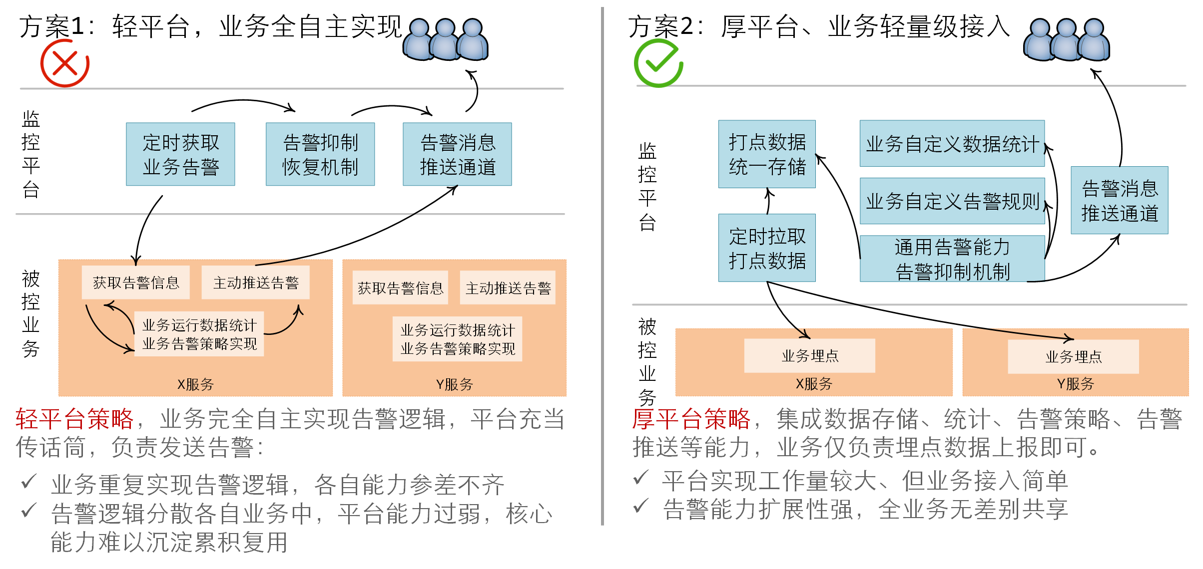 监控告警是开发与运维人员知晓线上系统异常状态的一个重要手段,实施的时候需要注意不要滥用告警通道。告警消息的发送最好支持分组聚合、消息抑制等能力,避免出现无用告警消息的狂轰滥炸,麻痹接收人员的神经、淹没真正重要的“求救”信号。同时,在构建监控告警平台的时候,考虑尽量独立于业务,让告警相关的逻辑从业务中解耦,降低监控对业务逻辑的侵蚀性。