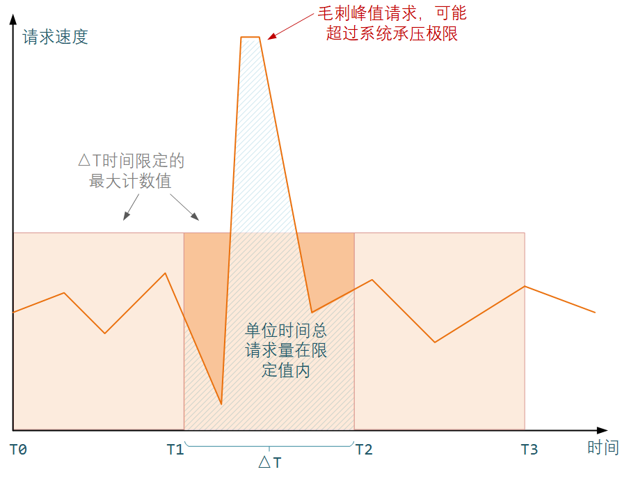 还有一种简陋的基于计数器的“伪限速”方案,这一思想很简单,每个计数周期维护一个计数器,然后来一个请求计数器就累加1次,计数满阈值后便拒绝后续请求,直到下一周计数器重新计数。这种本质上只能控制流量、无法控制过程流速,极端情况下的一些请求峰值,极有可能会击垮系统,要尽可能将流控计数周期设置的短一些,尽量避免在核心重要系统中使用此方案。