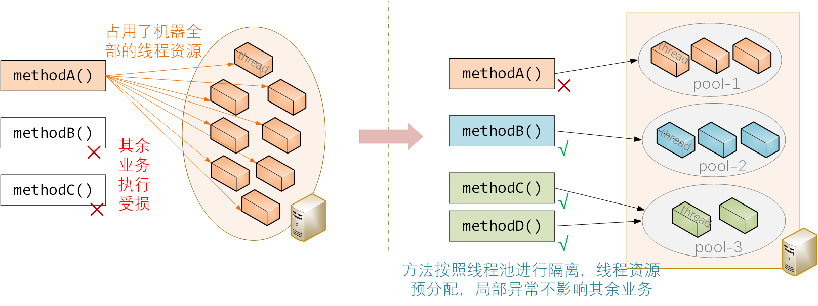 为了应对这种情况,可以基于线程池进行隔离设计,为主要业务处理方法指定对应的执行线程池,限定具体业务方法仅可以按照分配线程池提供的线程资源进行调度与使用,禁止业务方法自行无度占用系统的线程与CPU执行资源。这样一来,即使某个业务占用了自己全部线程池资源,依旧不会影响到其余线程池的正常处理,保障了其余业务的正常开展。