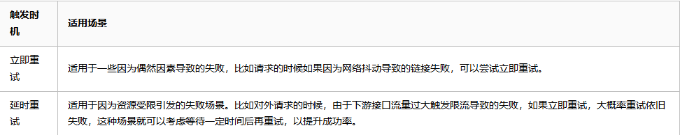 按照重试_触发时机_的不同,重试策略可以分为立即重试和延时重试: