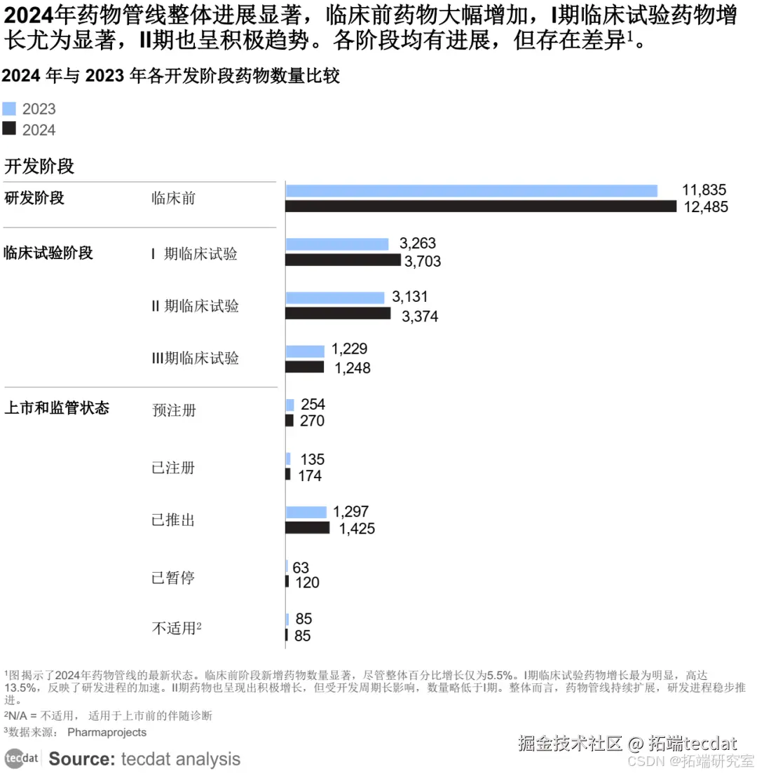 在增长百分比方面,I期药物的数量增长最为显著,增幅高达13.5%,较去年报告的10.7%有所加快。同样,II期药物的增长也呈现出积极的趋势,数量增长了7.8%,而去年的增长率为7.2%。