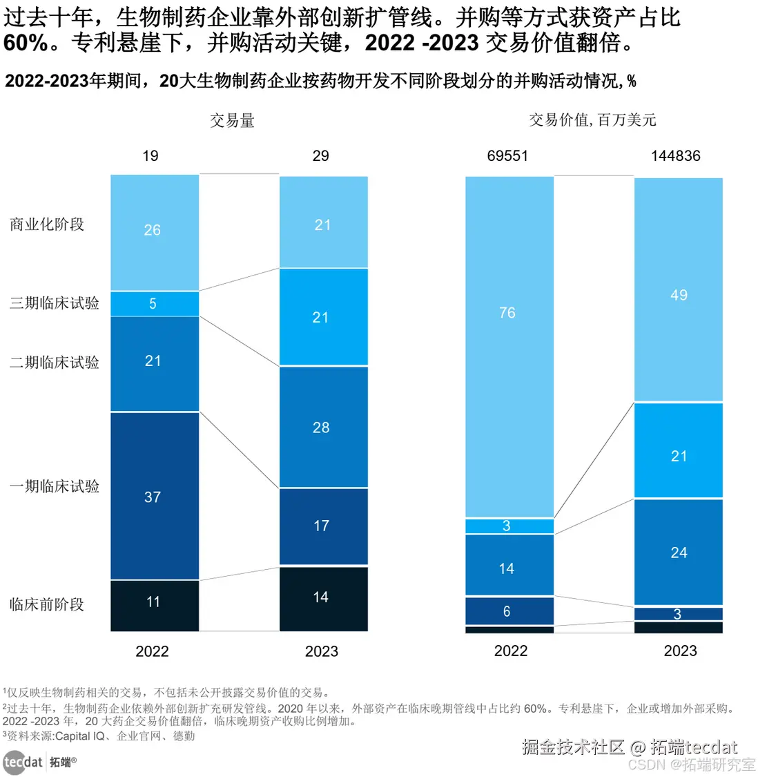 并购活动在生物制药行业中发挥着至关重要的作用,而即将来临的专利悬崖依旧是对行业发展有着重大影响的关键要素。随着生物制药企业谋求建立在治疗领域更为深入的专业知识,对于那些有着坚实数据支撑的高价值资产的收购竞争将会越发激烈。实际上,我们对 2022 年至 2023 年期间制药企业完成的并购交易状况进行了分析。如图 7 所示,从 2022 年到 2023 年,20 大生物制药企业完成的交易价值实现了翻番。2023 年,这些企业将更高比例的资金投入到临床晚期研发资产的收购当中,尤其是处于临床二期和三期的资产,这类交易的价值占比从 2022 年的 17% 增长至 2023 年的 45%。