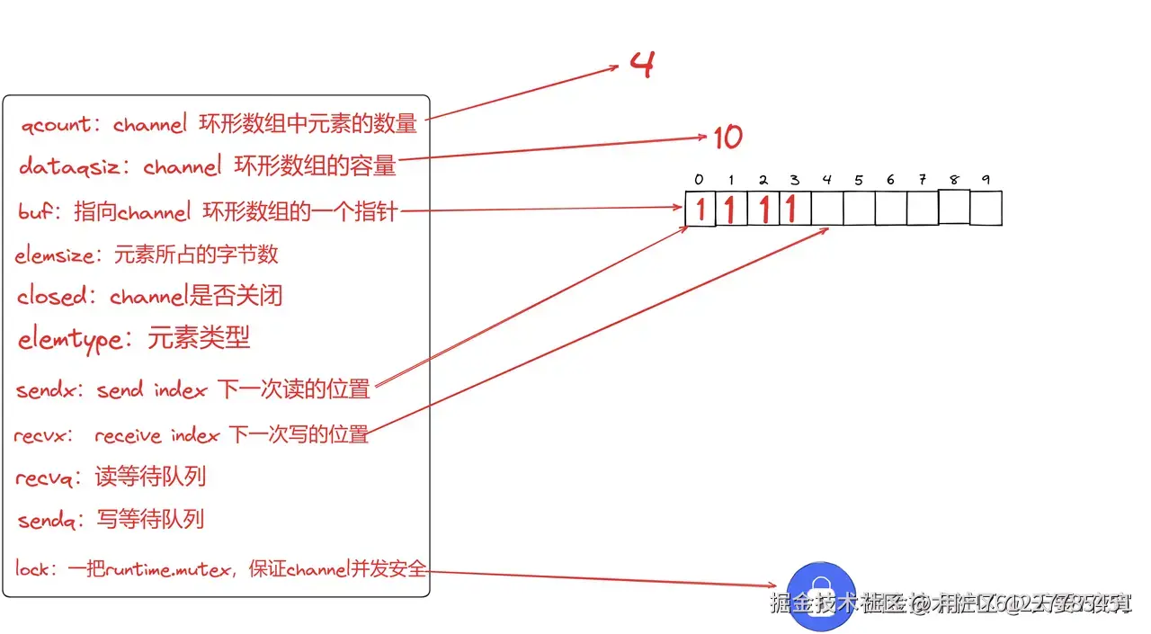 对于channel,我们可以将数据缓存到其中,所以有一个buf数组,用来缓冲数据,又因为channel可以同时提供读写功能,所以我们有sendx 和 recvx分别指向下一次写和下一次读的位置,buf、sendx,recvx 就构成了一个环形数组,每次读或写超过最后一个下标,就会回到下标0处。