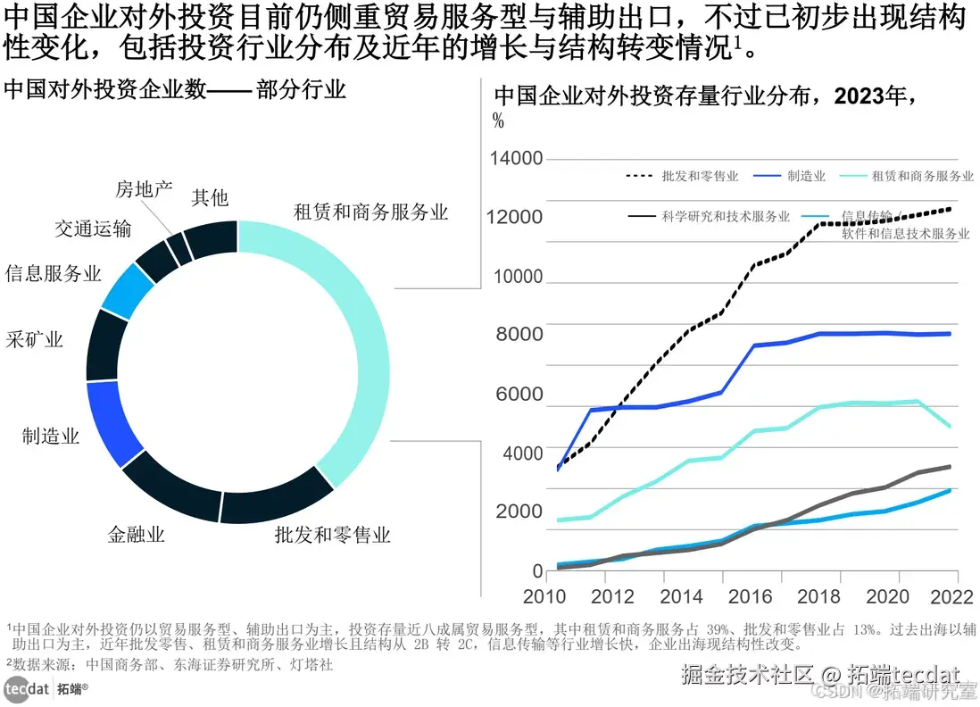 - 就近几年中国对外投资的企业数量来看,批发零售、租赁和商务服务业依然在迅速增长,然而结构产生了变化,从面向 2B 逐渐转向 2C,例如在批发零售领域,有众多是品牌出海;此外,信息传输、科学研究和技术服务业在近几年增长迅猛,这表明中国企业出海正在逐步呈现出结构性的改变。