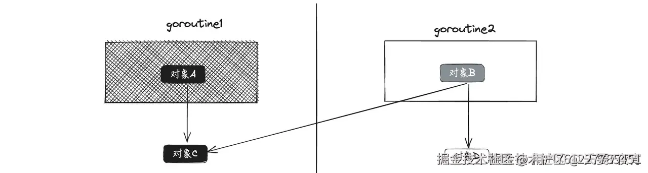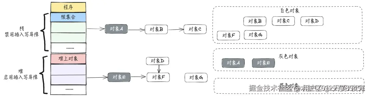 - 对象A 是 goroutine1 里栈上的一个对象,goroutine1里的栈空间已经扫描完了,并且 对象C 也扫描完标记为黑色的对象;
