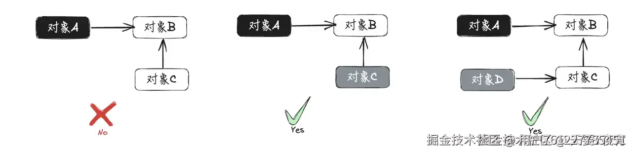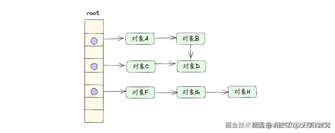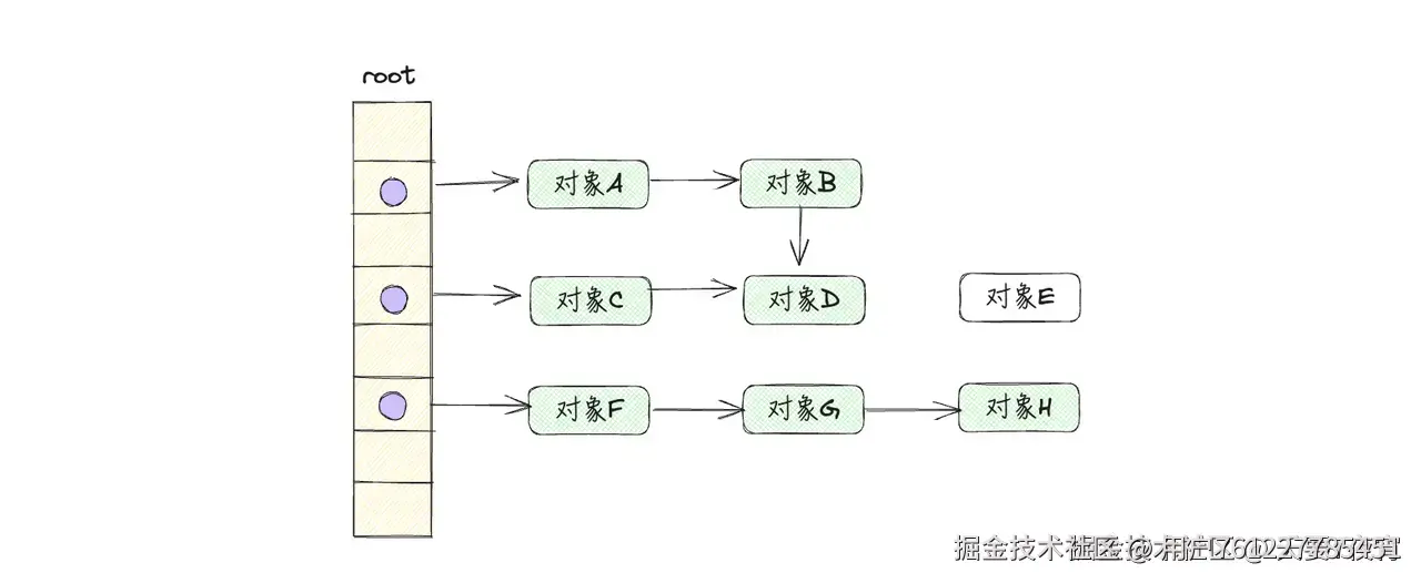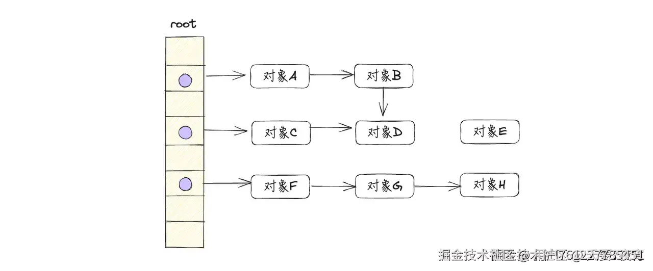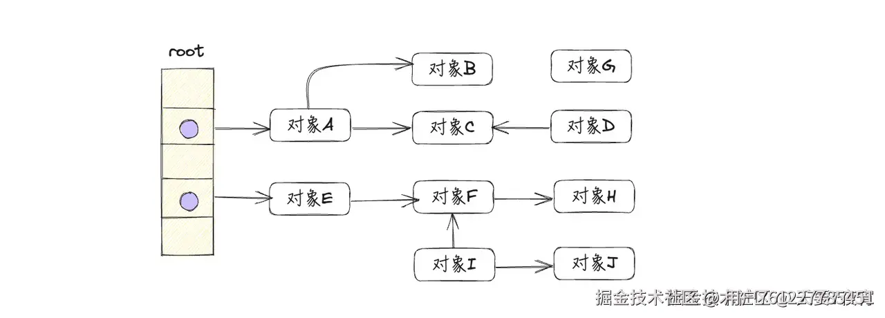 - 可达对象:对象A、对象B、对象C、对象D、对象F、对象G、对H