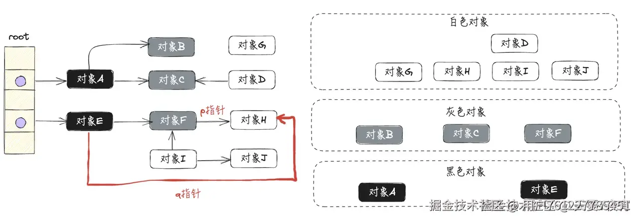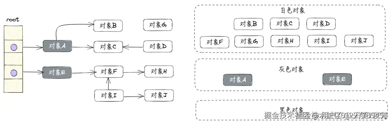 - 遍历灰色对象集合,将灰色对象标记为黑色,并将该对象指向的对象标记为灰色
