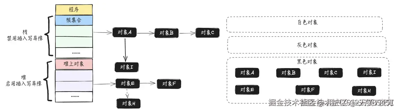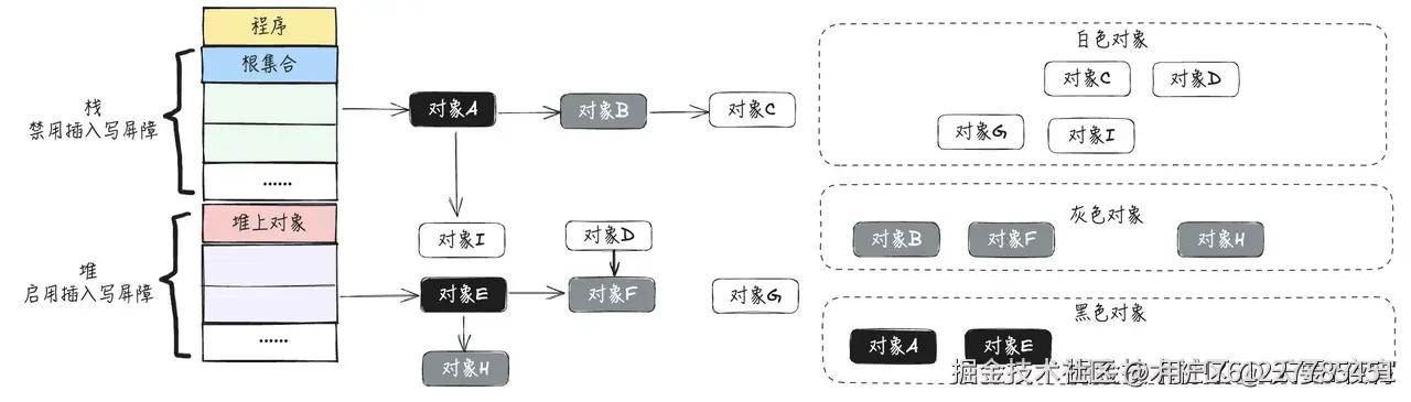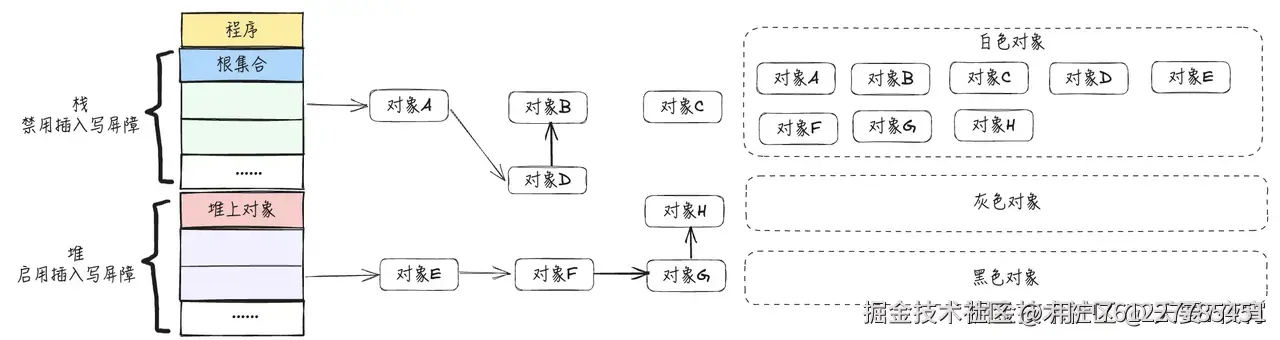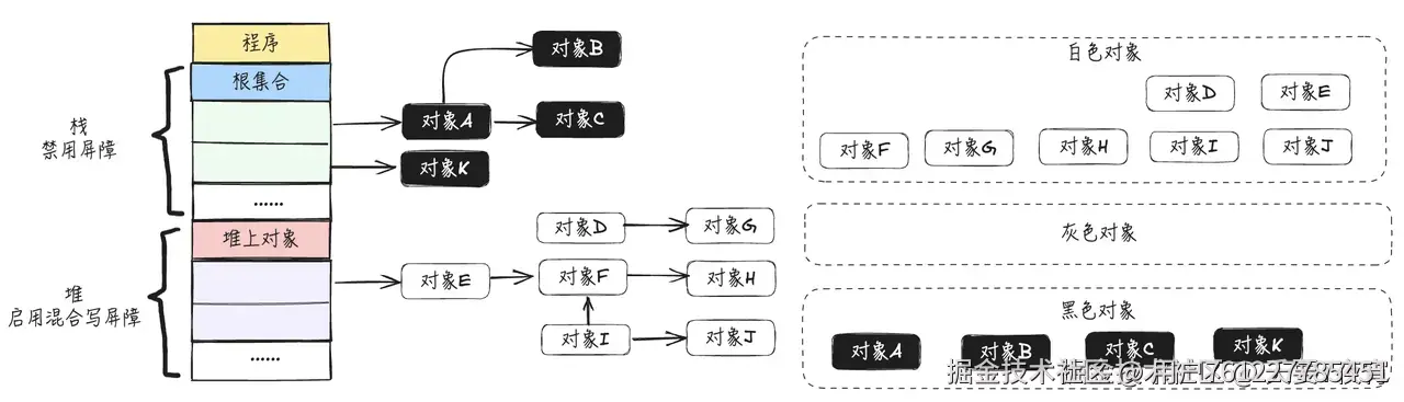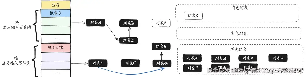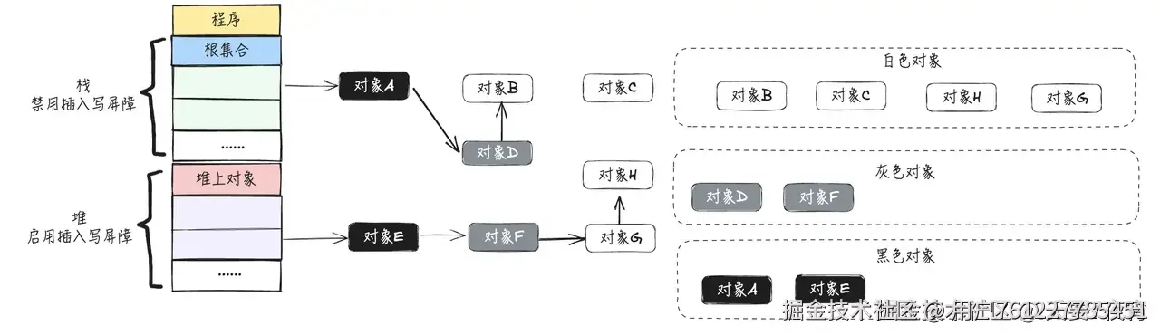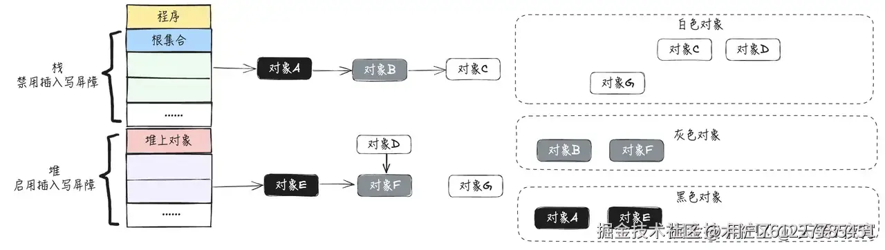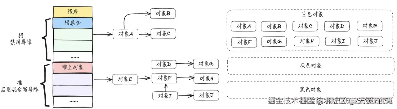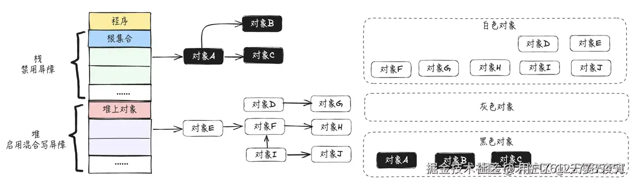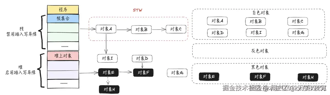 混合写屏障的基本思想是:对正在被覆盖的对象进行着色,且如果当前栈未扫描完成,则同样对指针进行着色。