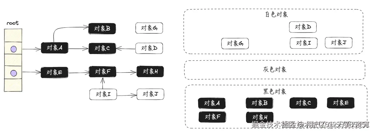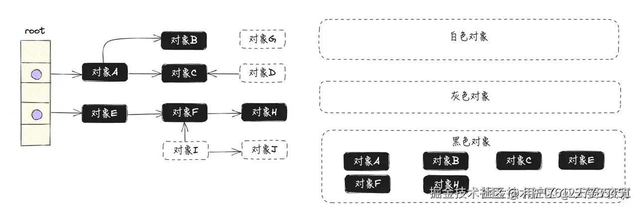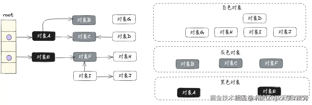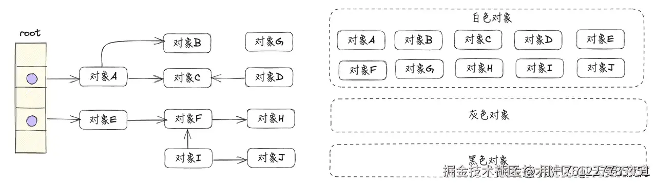 - 白色:未被垃圾收集器访问到的对象,也就是潜在的垃圾对象。在回收开始阶段 ,所有对象都标记为白色;在回收结束后,所有白色对象均不可达,其内存将被释放