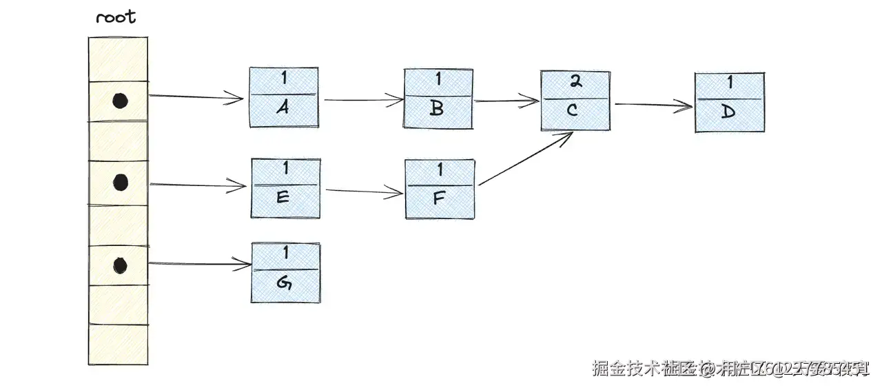 如上图所示,对象c由于有两个对象B,F引用,所以计数为2,其余节点计数都是1