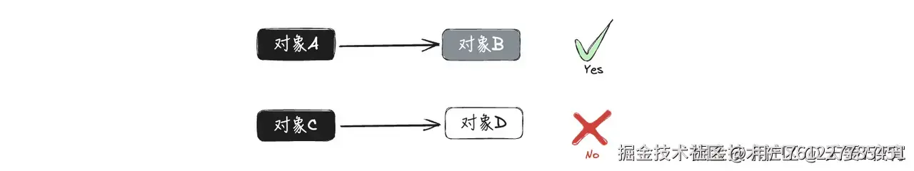 - 从根对象开始,逐一遍历每个对象及其子对象,并标记它们的可达状态,如下图所示: