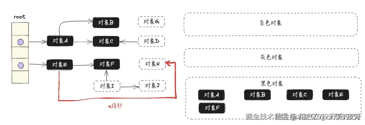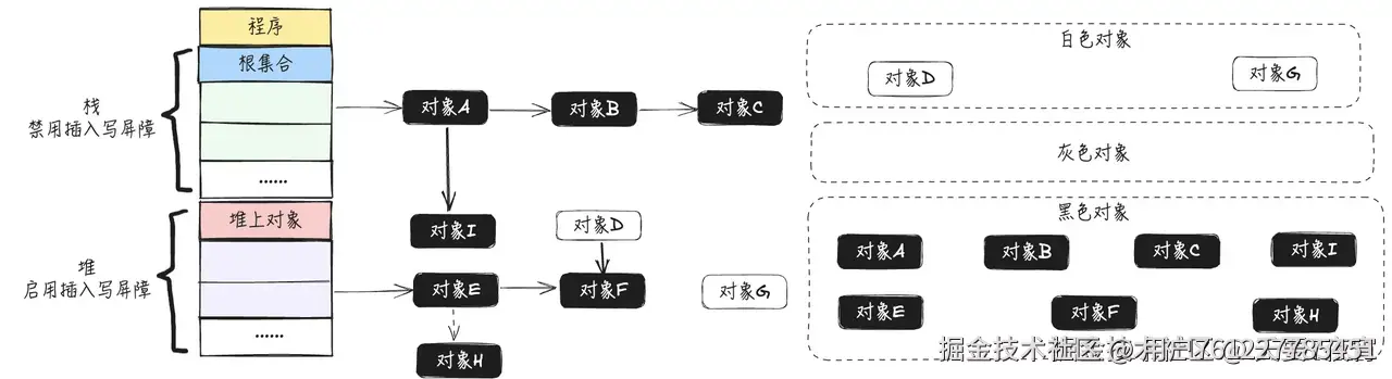 - 此时,对象E新增指针指向对象I,对象F删除对对象H的指针引用,触发混合写屏障,对象I标记为灰色,对象H标记为灰色