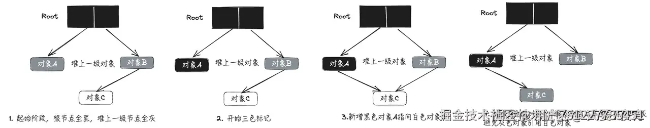 - 对象B删除对象C,触发删除写屏障,对象C置灰,避免黑色对象引用白色对象