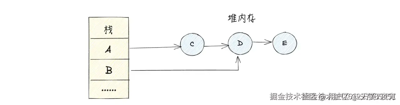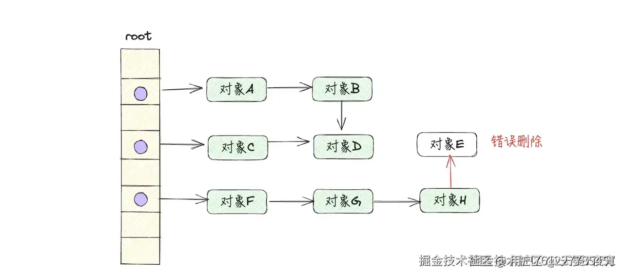 我们在手动free对象的时候,根据当前程序链路A-->C-->D-->E,依次free对象,当free掉D,E对象之后,只剩下C对象,貌似没有问题,但是其实还有其他的对象B引用了D对象,这样就造成了悬挂指针问题