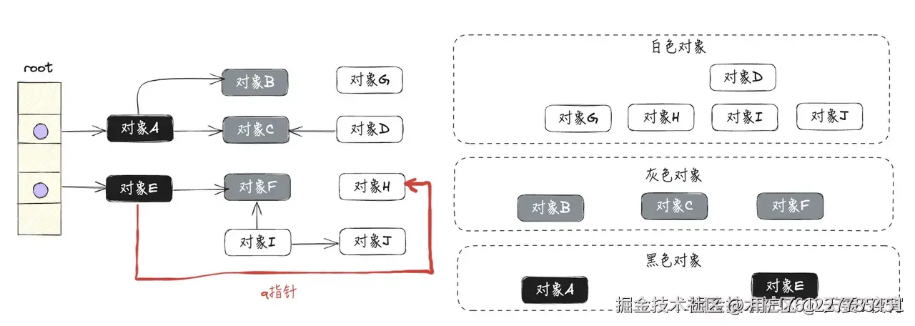 三色标记法将程序中的对象分为三类:白色、灰色和黑色