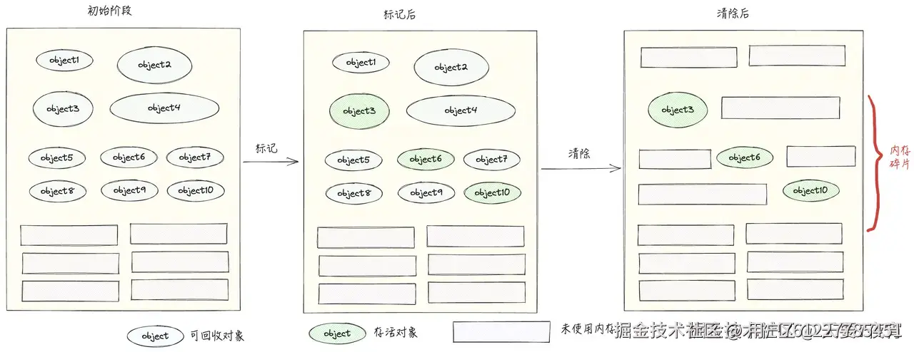 - 清除阶段:遍历内存中所有对象,清除那些没有被标记的对象