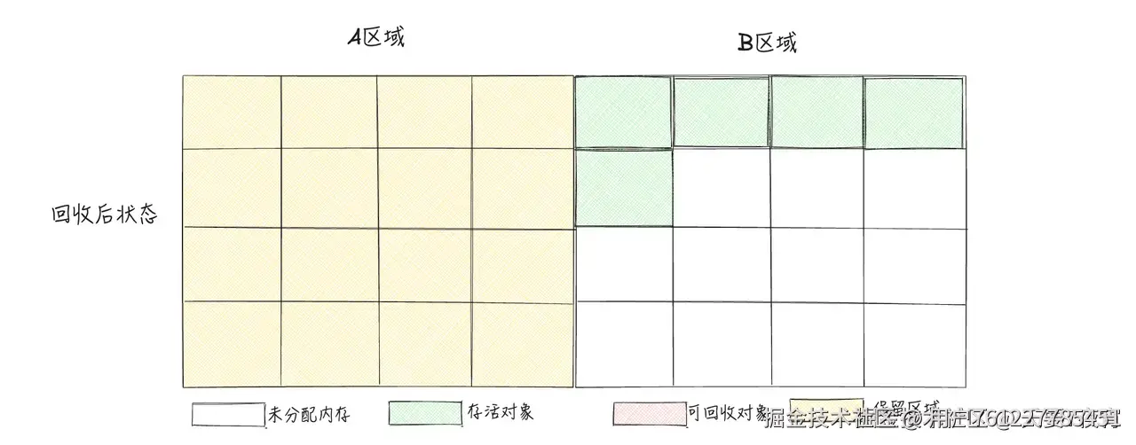 整理:接下来,所有存活对象会被移动到一端的空闲空间,按照内存地址进行排序,并更新相应的引用指针。然后,清理掉末端内存地址之外的所有内存空间。